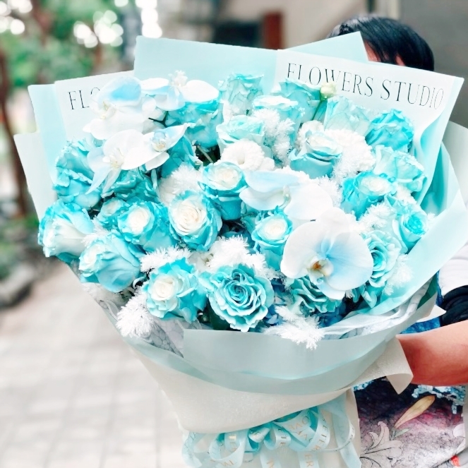 蝶戀系列-冰藍進口玫瑰花束16朵+白.藍桔梗以及蝴蝶花點綴混搭