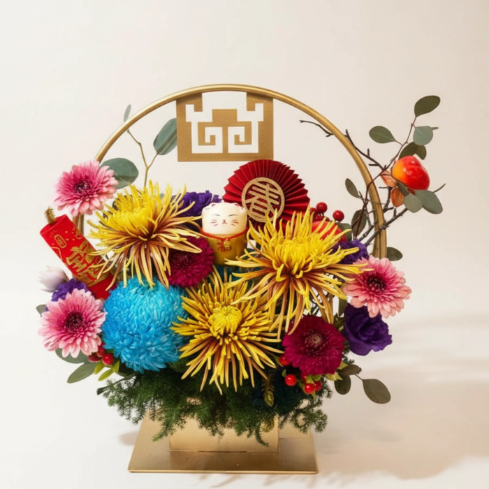 煙火菊3朵+牡丹菊+小菊+桔梗+當季葉材+金色花器